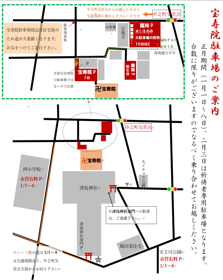 お正月期間の津島神社及び宝寿院周辺は大変混雑します。(特に1〜5日)お時間に余裕をもってお出かけください。また、正月期間は津島西小学校や天王川公園が初詣用臨時駐車場として開放されますが、ご祈祷お申し込みの方は宝寿院の駐車場をご利用下さい。(交通規制をしている場合でも宝寿院に用事がある旨を伝えて頂けば通してもらえます)