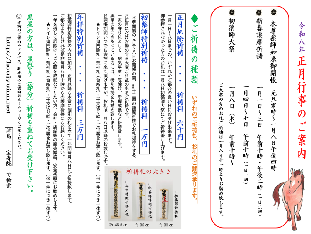本年も残すところあと僅かとなりました。宝寿院では日頃より皆様の所願成就・災厄消除のご祈祷を勤めておりますが、お正月は本尊薬師如来お開帳のもと特に晴れ晴れと護摩祈祷を厳修致します。ご自身やご家族の一年の健康・安寧を仏様に祈りましょう。