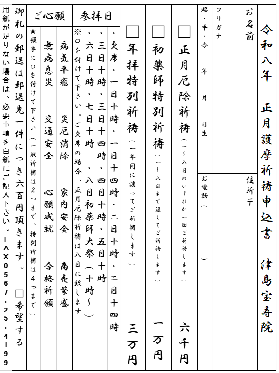 ①正月の津島神社周辺は大変混雑します。車でお越しの場合は特に時間に余裕をもってお越し下さい。当日お申込みの方は法要開始30分前にはお越し下さい。